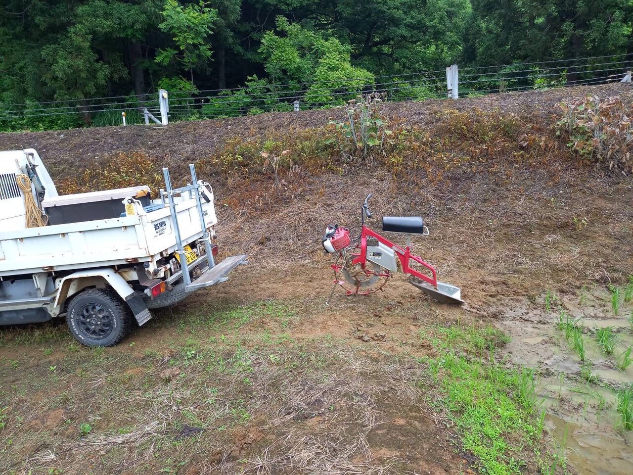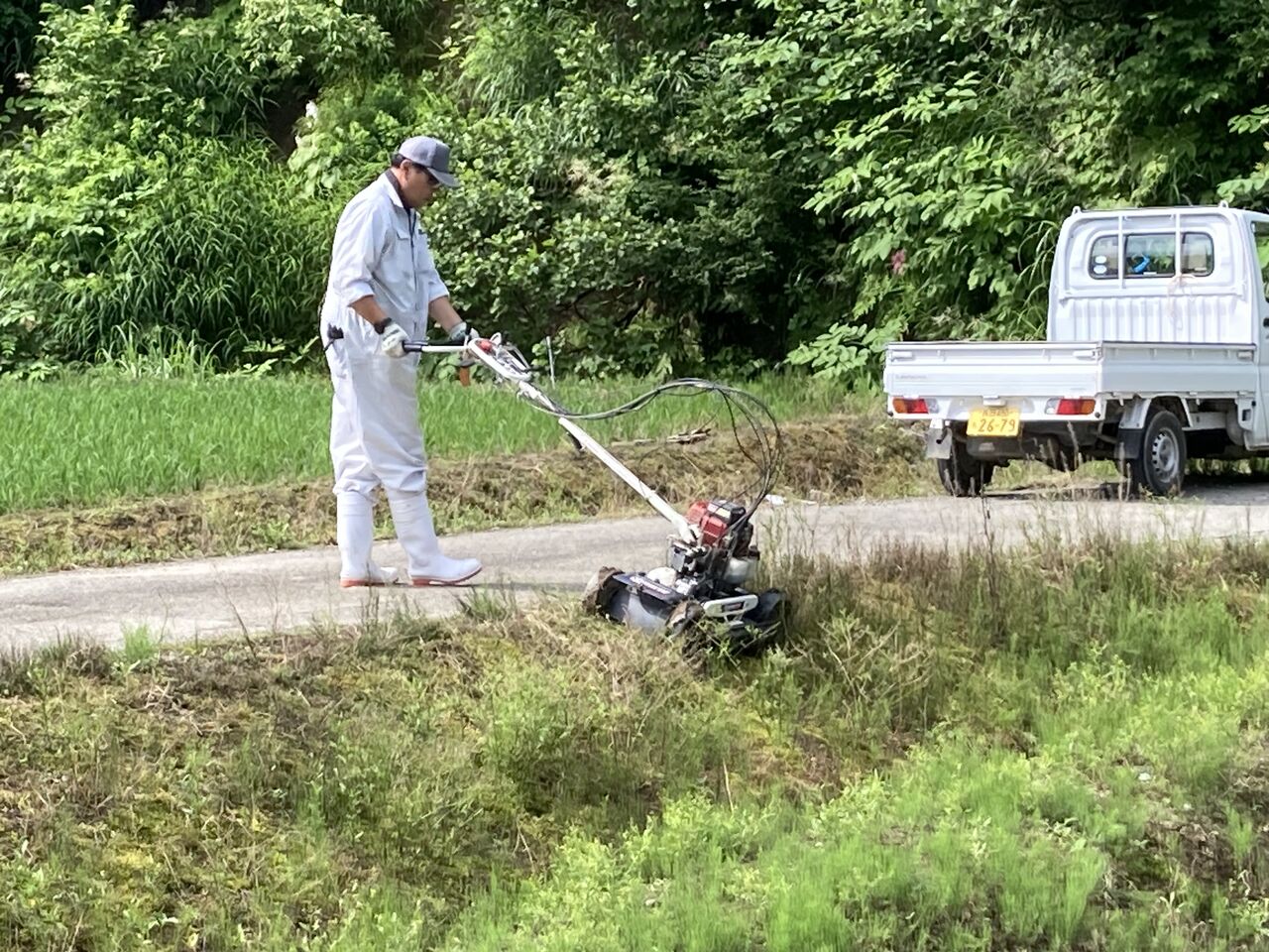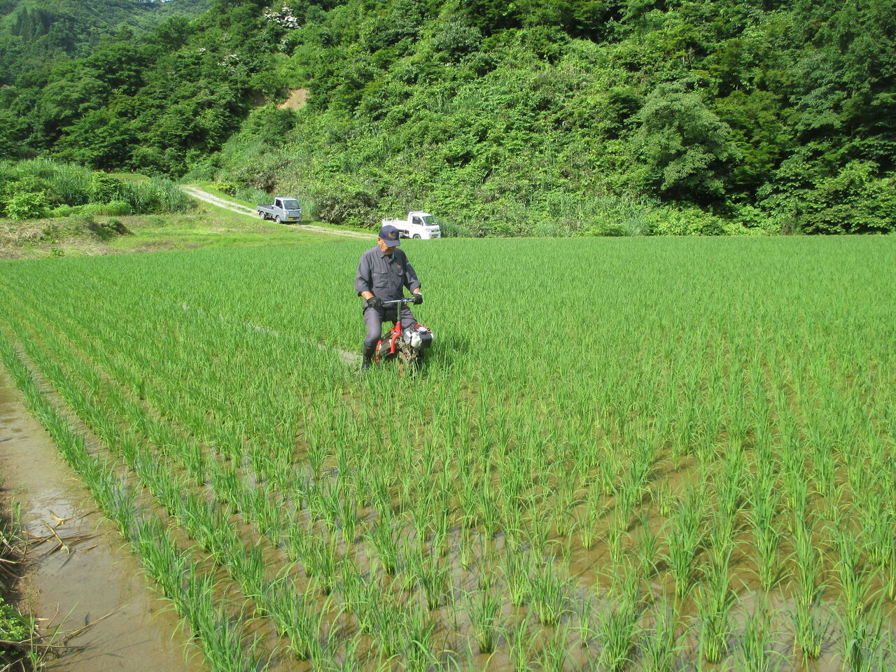 2023年06月18日 溝切作業 6月13日から溝切作業が始まりました。今は乗用の溝切機で行いますが、歩行の溝切機は重労働でした。だいぶ重労働が緩和されましたが、1日に乗ていると尻や股が痛くなる大変な作業には変わりありません。溝を切った後、水の流れを良くするために溝を繋ぐ作業もあります。こうすることで、田を固くし稲の根を深く張らせることと夏に水が田にまんべんなく行きわたらせる効果があります。また、秋の刈り入れ時に田を固くしてコンバインが埋まらないようにします。草刈りの作業に新しく自走の草刈り機を試験に使ってみました。芝刈り機のようなものなので、平のところでは使い勝手が良いが畦畔の高いところは慣れるまで大変な感じです。