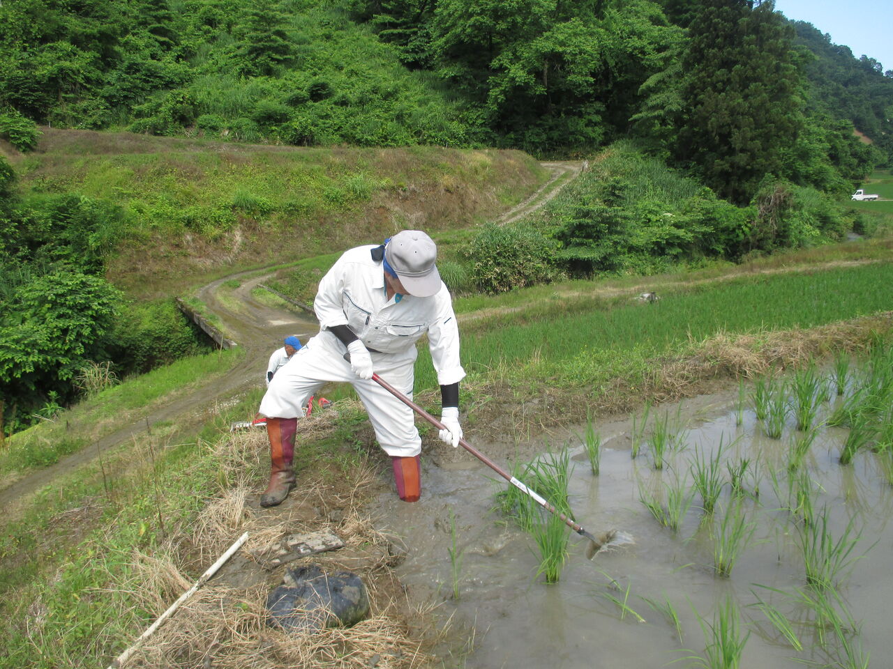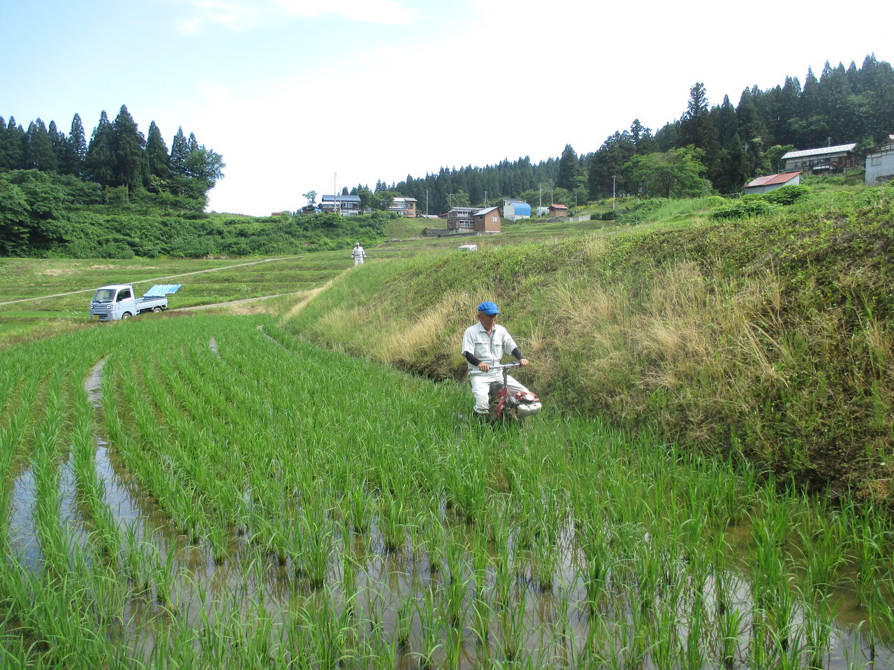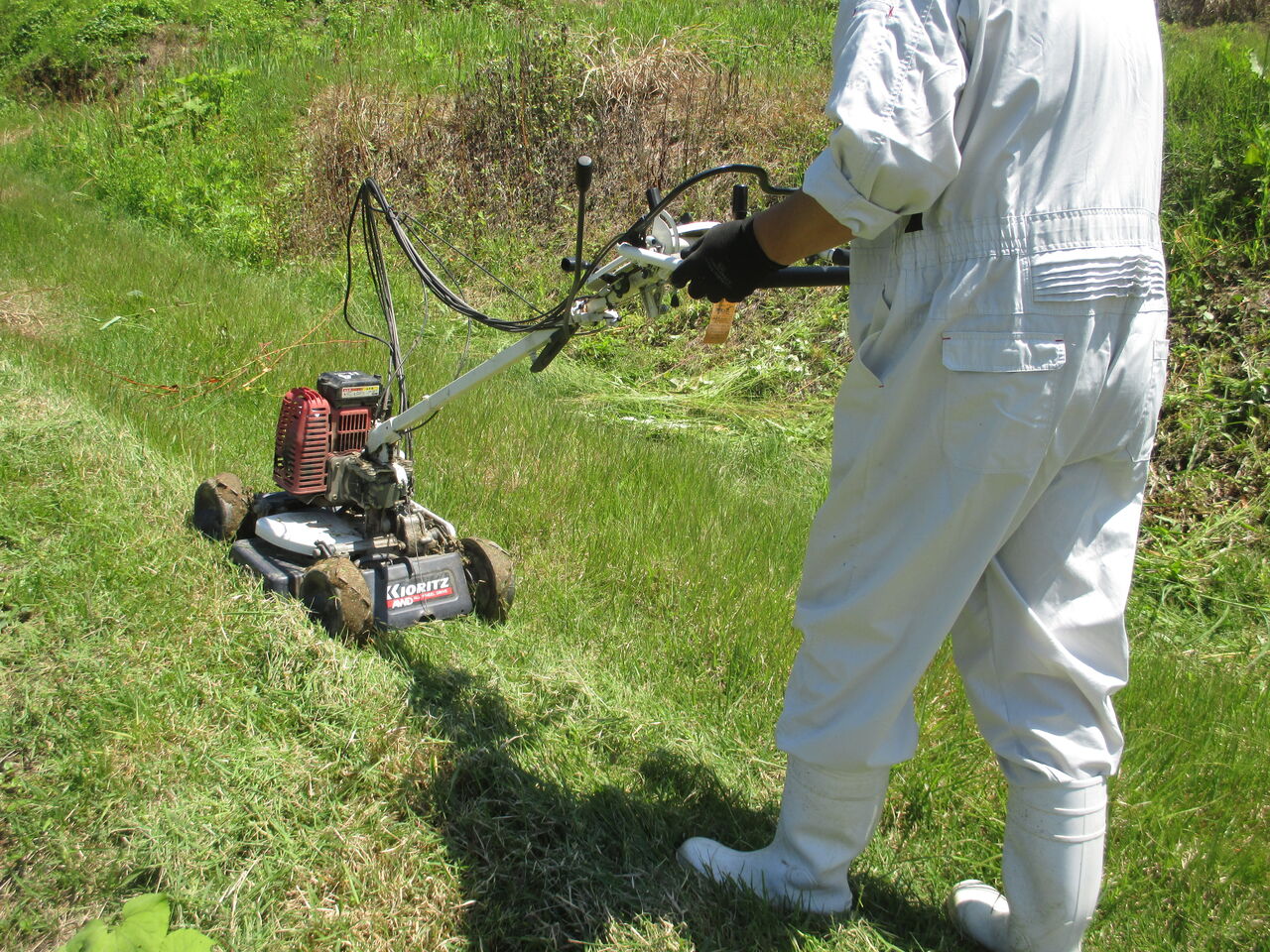 2023年06月18日 溝切作業 6月13日から溝切作業が始まりました。今は乗用の溝切機で行いますが、歩行の溝切機は重労働でした。だいぶ重労働が緩和されましたが、1日に乗ていると尻や股が痛くなる大変な作業には変わりありません。溝を切った後、水の流れを良くするために溝を繋ぐ作業もあります。こうすることで、田を固くし稲の根を深く張らせることと夏に水が田にまんべんなく行きわたらせる効果があります。また、秋の刈り入れ時に田を固くしてコンバインが埋まらないようにします。草刈りの作業に新しく自走の草刈り機を試験に使ってみました。芝刈り機のようなものなので、平のところでは使い勝手が良いが畦畔の高いところは慣れるまで大変な感じです。